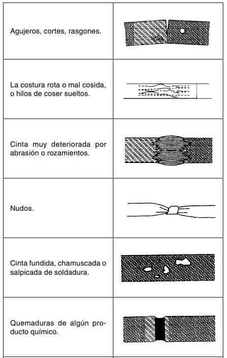 - Cortes longitudinales o transversales, cortes o deterioro por desgaste en los extremos, cortes en el cosido o en los ojales (gazas)