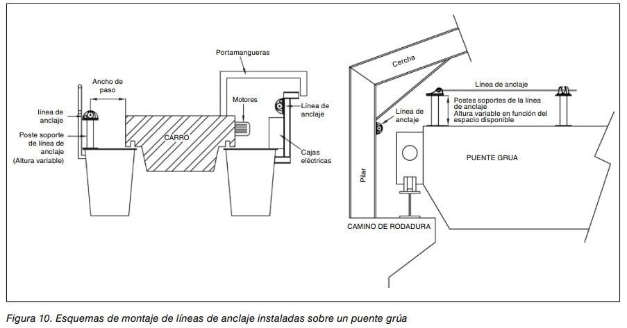 En una línea de anclaje sobre un puente grúa hay que tener en cuenta la gran cantidad de elementos fijos o móviles que pueden interferir en la trayectoria de la línea tales como: