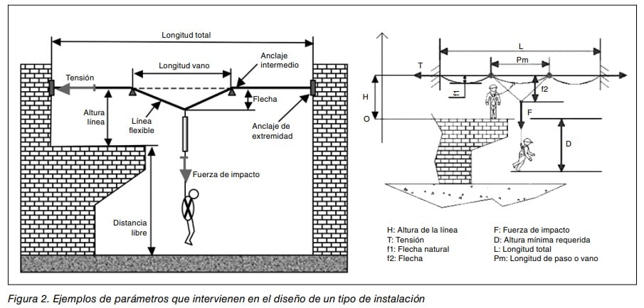 - Una nota de cálculo suministrada por el fabricante (que especificará el comportamiento mecánico de la línea de anclaje en caso de caída en función de los distintos parámetros geométricos) permitirá al responsable del diseño de la instalación determinar la longitud de vano idónea. En otras ocasiones se debe hacer la nota de cálculo a partir del dato del vano disponible, para conocer la viabilidad de la línea.