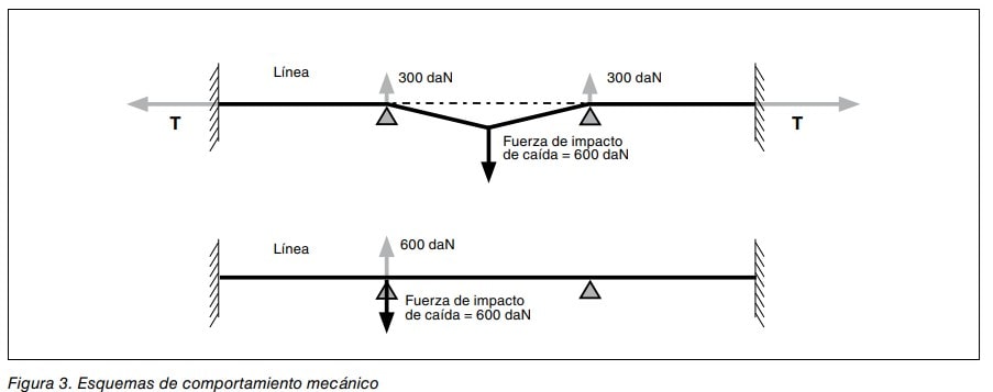 Los esquemas de la figura 3 representan los dos casos más desfavorables de caída, siendo la fuerza de impacto aplicada en el centro de un vano (entre dos anclajes intermedios) o en un anclaje intermedio.