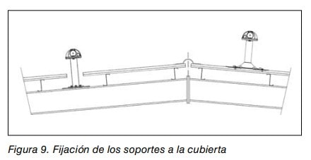 - b. Fijación de los soportes: debido a la posible debilidad de las estructuras de los tejados, se ha de asegurar que semejantes estructuras puedan aguantar los es fuerzos mencionados en el apartado factores técnicos Ver fig.9. Se debe tener la certeza de que la estructura puede soportar los esfuerzos previstos en la nota de cálculo. En el caso de tener que recortar la cubierta para instalar un poste, se debe tener en cuenta la pérdida de resis tencia de la misma y tomar las medidas necesarias.
