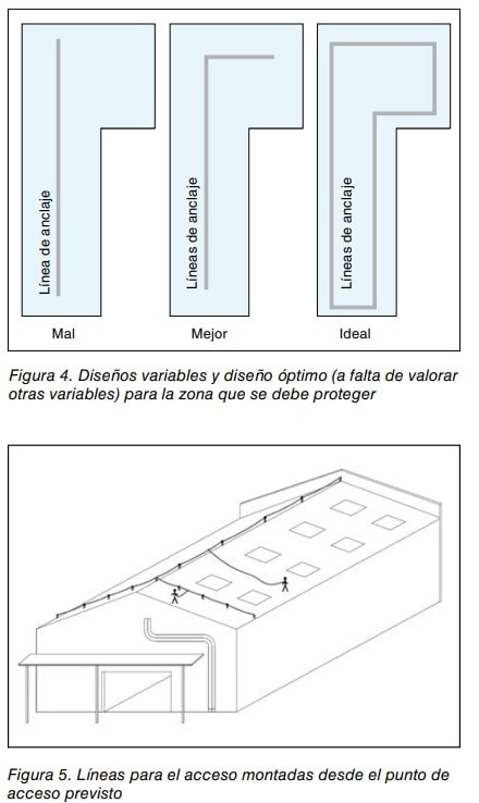 - Puntos de acceso. Se deben diseñar los suficientes puntos de acceso para que el usuario no deba recorrer grandes distancias unido a la línea de anclaje para llegar al lugar de trabajo.