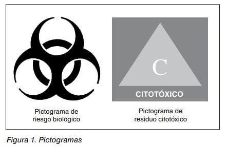 En función de la normativa autonómica, los envases utilizados para la recogida de los residuos de los diferentes grupos, deben estar adecuadamente señalizados. En algunos casos, con el pictograma de riesgo biológico o de citotóxico y en otros, además, se incluye la indicación del tipo de residuo que contiene.