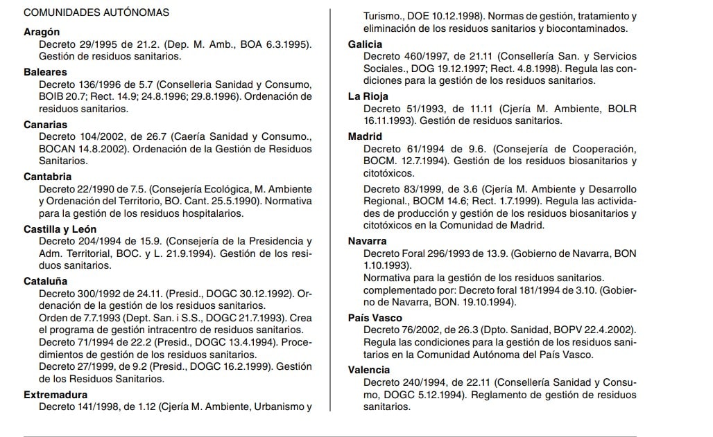 - En Aragón, la normativa señala que: “Es objeto del presente Decreto el establecimiento de los requisitos mínimos exigibles en la gestión de los residuos sanitarios, a fin de prevenir los riesgos que dicha gestión genera tanto para las personas directamente expuestas a los mismos como para la salud pública y el medio ambiente”.