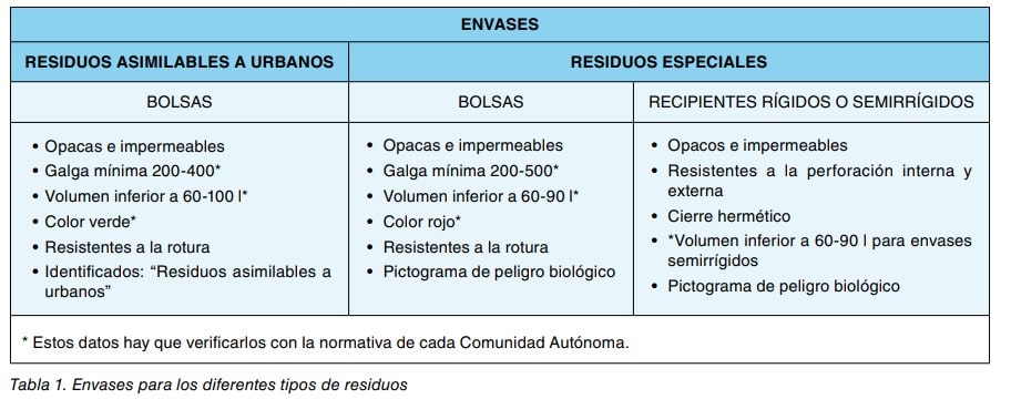 En la tabla 1 se relacionan las características de los envases comunes a las diferentes normativas de acuerdo con el tipo de residuo, indicando con un asterisco aque llos puntos que deben confirmarse con la legislación aplicable, como es el color, las galgas de las bolsas y el volumen de los envases.