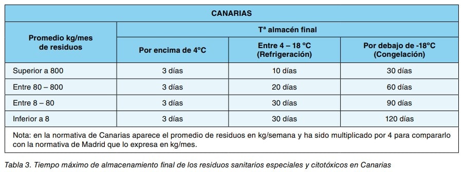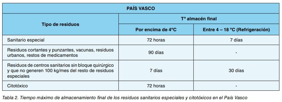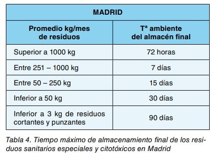 Los residuos sanitarios pueden almacenarse en el mismo edificio (en el denominado “almacén final”) durante un período máximo de 72 horas, que puede ampliarse a una semana (15 días en Galicia) si el almacén de residuos dispone de un sistema de refrigeración (temperatura máxima de: 4 ºC). Sin embargo, en el caso de Baleares, el periodo máximo de recogida del almacén final es de 24 horas y si está refrigerado puede llegar a ser de 5 días.