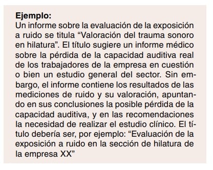 El informe higiénico debe ser completo, pero breve, es decir, en él se debe exponer todo lo que realmente interesa y obviar lo que carece de interés respecto al objetivo del informe. Debe ser claro y estar redactado de forma precisa alejada tanto de complejidades científicas, cuando éstas no sean necesarias, como de interpretaciones ambiguas. Las primeras, en ocasiones, no son información esencial, no son comprensibles para todos los posibles lectores del informe, lo alargan innecesariamente y pueden caINFORMACIÓN 2 Notas Técnicas de Prevención muflar los resultados realmente importantes. En cuanto a la segunda observación, es preciso cuidar la redacción de forma que se incluya la información necesaria para la unívoca comprensión de lo que se pretende explicar. Es frecuente que al redactar algo, lo escrito solo exprese parte del pensamiento elaborado por el redactor (parte de la información se da por sabida), lo que podría conducir a una incorrecta interpretación por parte del lector.