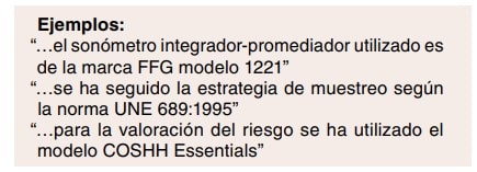 Con independencia de la metodología seguida, en este apartado deben quedar debidamente referenciados: el nombre del método, los equipos de muestreo utilizados o los modelos empleados para una valoración cualitativa, los datos del laboratorio externo encargado del análisis de las muestras, etc.