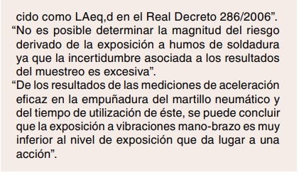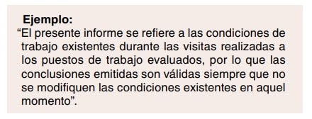 Como se indica al inicio de esta nota técnica, el informe higiénico es la expresión escrita, precisa, clara y breve de determinadas actividades realizadas para la evaluación de riesgos. De su contenido se derivarán las actuaciones necesarias para corregir las deficiencias detectadas o para mejorar las condiciones de trabajo, así como las responsabilidades que pudieran derivarse. Es por tanto esencial que en el informe queden claramente reflejadas las limitaciones existentes. En numerosas ocasiones, las observaciones realizadas por el técnico higienista y las condiciones ambientales y de trabajo existentes responden a circunstancias puntuales, es decir, las propias del momento en que se lleva a cabo el estudio. En ese sentido, el autor se responsabiliza del contenido expresado en el informe, pero no de que las condiciones higiénicas de la actividad sean siempre las adecuadas.