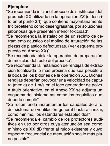 En este apartado se describen las actuaciones que, a juicio del técnico higienista, serían necesarias para la resolución de los riesgos higiénicos valorados, dejando clara la jerarquización de las medidas preventivas y justificando dicha jerarquización en la máxima eficacia preventiva de las mismas.