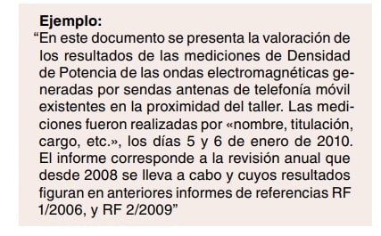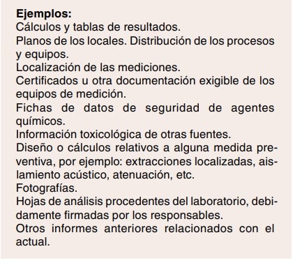 Por otra parte y para facilitar la comprensión del informe, aquella información más exhaustiva que se considere necesaria sobre: el método analítico, los certificados de calibración de los equipos de muestreo, las copias de los informes del laboratorio, las operaciones de cálculo de los resultados, etc. , puede adjuntarse en los anexos informativos.