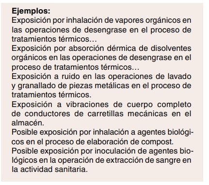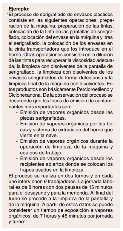 En este punto se debería incluir una descripción sucinta, clara y ordenada del proceso productivo, de las operaciones, los equipos, las formas de energía aplicadas, las materias primas y las cantidades utilizadas destinados a obtener el producto final, los productos intermedios, los posibles subproductos, etc. Asimismo, debería incluir las características físicas del proceso y de cualquier elemento incorporado al mismo destinado a la protección tanto del elemento fabricado como a la protección de la seguridad y salud del trabajador. De esa descriptiva y de los datos recabados durante el proceso de evaluación, se debería poder citar los posibles focos de contaminación y establecer: ciclos de trabajo, tiempos de exposición, grupos homogéneos de trabajo, etc.