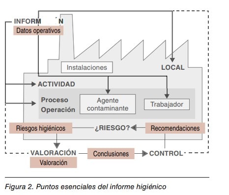 - La parte central o cuerpo del informe donde se incluye la información esencial para la comprensión del mismo. En términos generales, se pueden distinguir cinco apartados: «datos operativos» donde se resume la base informativa de la evaluación; «posibles riesgos higiénicos» donde se destacan los posibles riesgos hi giénicos detectados y las operaciones de trabajo a las que se asocian; «valoración» que resume el método de valoración del riesgo y los resultados obtenidos; «con clusiones» de la valoración donde se establece el nivel del riesgo y «recomendaciones» donde se recogen las medidas preventivas concretas y lo más específicas posible para el control del riesgo. En la figura 2 se muestran los principales apartados del informe higiénico relacionados con las diferentes etapas del proceso de evaluación.