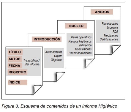 - La parte final donde se recoge la información (Anexos informativos) que amplía o complementa la información contenida en el cuerpo del informe, como por ejemplo fotografías, planos, etc. En la figura 3 se muestran, en esquema, los contenidos del informe higiénico.