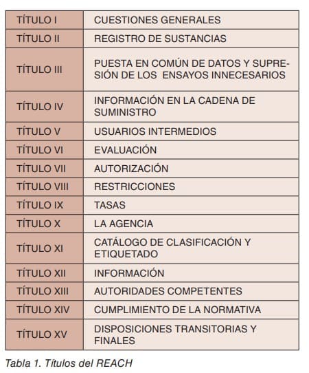 El Reglamento REACH se estructura en 131 Considerandos previos, 141 Artículos, agrupados en 15 Títulos, 17 Anexos y 10 Apéndices. En la tabla 1, se incluye el listado de Títulos, de interés por lo que se comenta en el apartado siguiente.
