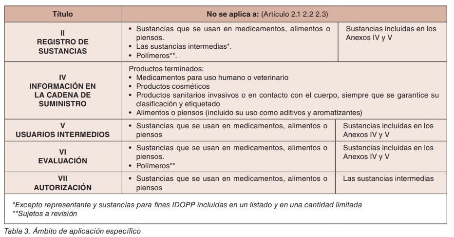 En la tabla 3, también referente a exenciones, se relacionan los Títulos del Reglamento que no son de aplicación a distintas familias de sustancias.