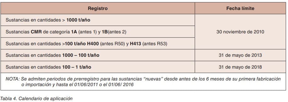 En la tabla 4 se representa el plan de registro de las sustancias según peligrosidad y cantidad fabricada o importada. El primer periodo de registro para las sustancias con mayor volumen (>1000 t/año) y las consideradas como más peligrosas para la salud (cancerígenas, mutágenas y tóxicas de la reproducción) y para el medio ambiente acuático, finalizó el 30 de noviembre de 2010. Aunque el conjunto del REACH tiene un plazo de puesta en marcha que no concluye hasta el 31 de mayo de 2018, es evidente que las sustancias de mayor uso y más peli grosas se hallan bajo REACH.