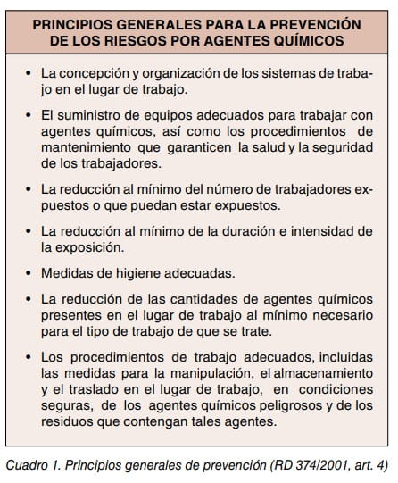 (1) Real Decreto 374/2001, de 6 de abril sobre la protección de la salud y seguridad de los trabajadores contra los riesgos relacionados con los agentes químicos durante el trabajo. BOE nº 104 de 1 de mayo de 2001.