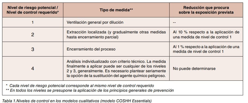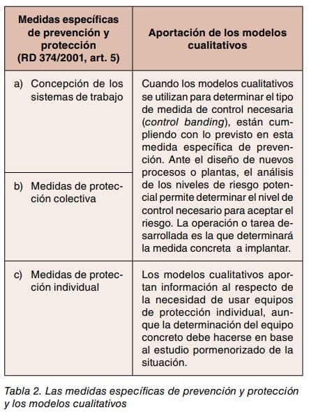 Dentro del marco general que trazan los principios de prevención existen situaciones o circunstancias que requieren medidas de carácter marcadamente técnico para poder ser aceptadas como seguras. Estas medidas, denominadas medidas específicas de prevención en el Real Decreto 374/2001 están priorizadas, de forma que no debe aceptarse o recurrirse a una medida de orden inferior si existe una de orden superior posible. En esta misma idea se fundamentan los modelos cualitativos cuando establecen unos grupos o bandas de medidas de creciente grado de rigurosidad, que se muestran en la tabla 1.