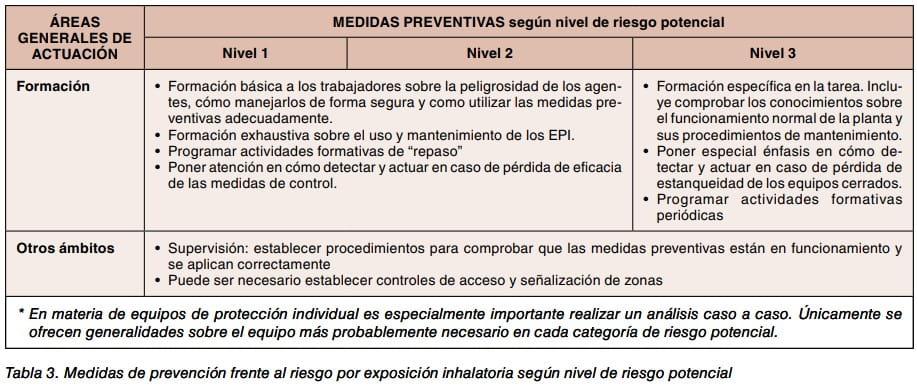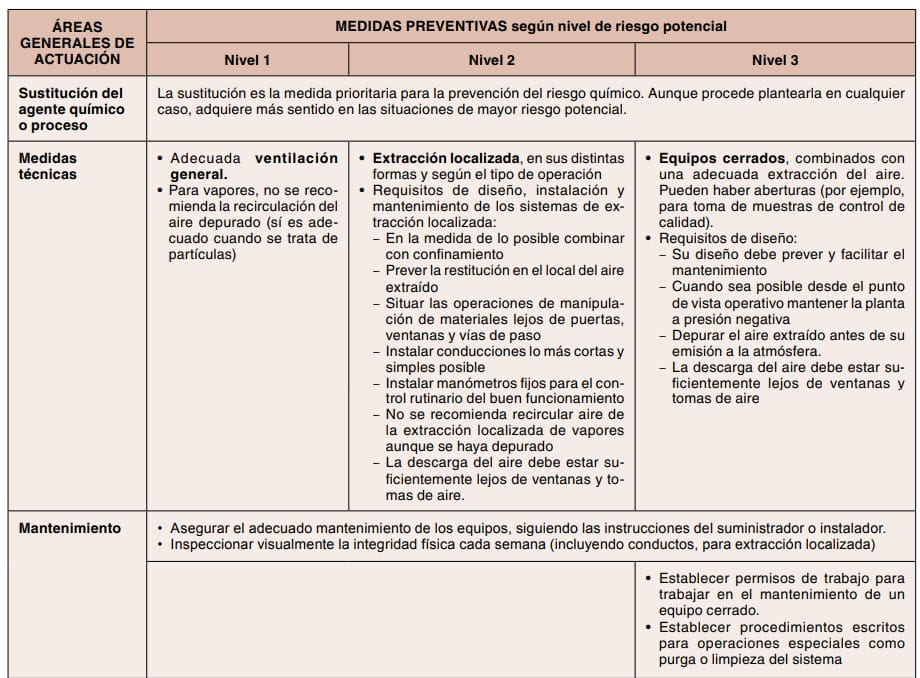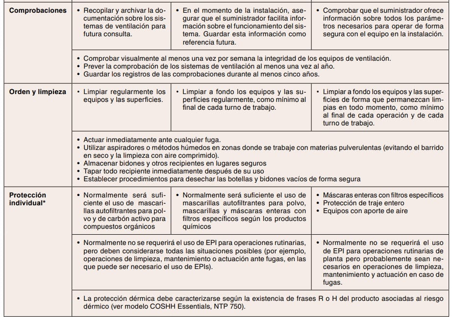 Las distintas medidas de prevención del riesgo por inhalación de agentes químicos están organizadas en 3 grupos en el Real Decreto 374/2001, que tienen su correspondencia (ver comentarios en la Tabla 2) con los grupos propuestos por la mayoría de modelos cualitativos.