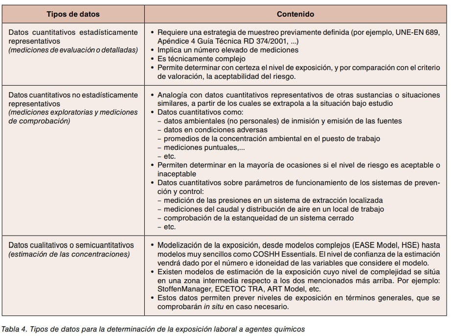Este proceso, que requiere en cualquier caso de un juicio técnico, puede a llevarse a cabo de distinta forma pero siempre implicará una estimación (cualitativa o cuantitativa) del nivel de exposición para su comparación con un criterio de valoración que permita decidir si la situación es o no aceptable. La estimación cualitativa está basada en la experiencia del evaluador y la comparación con situaciones similares para las cuales sí se dispone de datos cuantitativos. La estimación cuantitativa implica medir las concentraciones ambientales, algo que puede hacerse a distintos niveles de profundidad, distinguiéndose, de entrada, las mediciones estadísticamente representativas de la exposición diaria de las que no lo son. Las mediciones no estadísticamente representativas (tabla 4) permiten obtener valores, normalmente sobreestimados, cuya aceptación implica también la aceptación de la exposición sufrida por el trabajador. Son más sencillos de obtener que las estadísticamente representativas, y en definitiva, sirven para confirmar la idoneidad de la medida preventiva, que es el objetivo que se persigue. Se puede establecer, además, un programa de mediciones periódicas de este tipo, y así controlar a través del tiempo que las condiciones de exposición siguen estables y controladas.