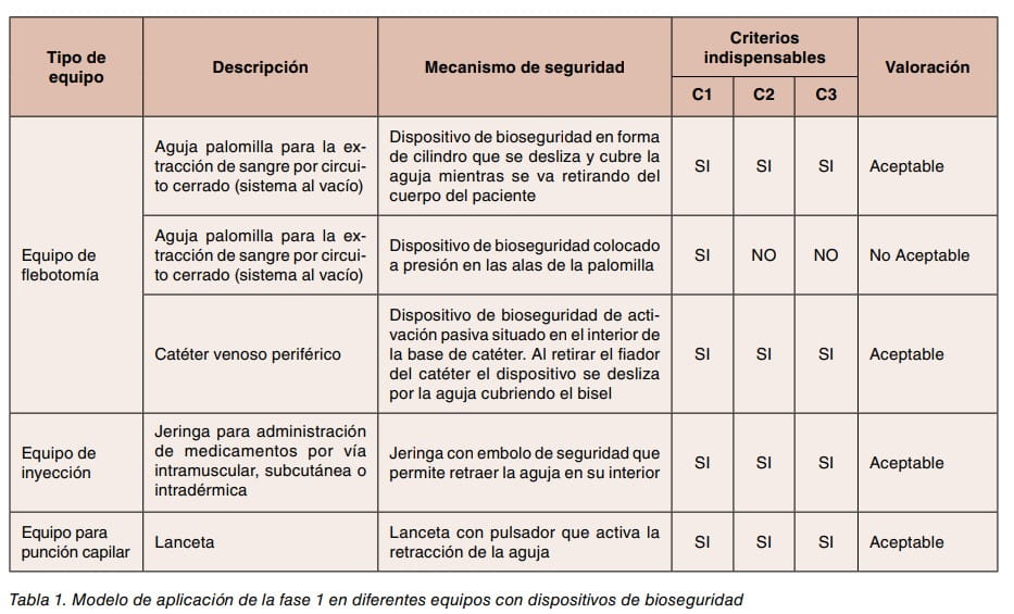 Un grupo de trabajo constituido por enfermeras del trabajo y técnicos de prevención del Institut Català de la Salut (ICS)(*), realizaron un análisis para conocer la situación y el grado de introducción de los dispositivos de bioseguridad en los centros sanitarios. Como conclusión del estudio se recomendaba evaluar los dispositivos antes de su adquisición, el desarrollo de esta metodología es una adaptación de la labor de estos profesionales.