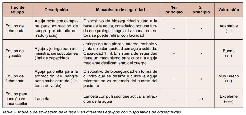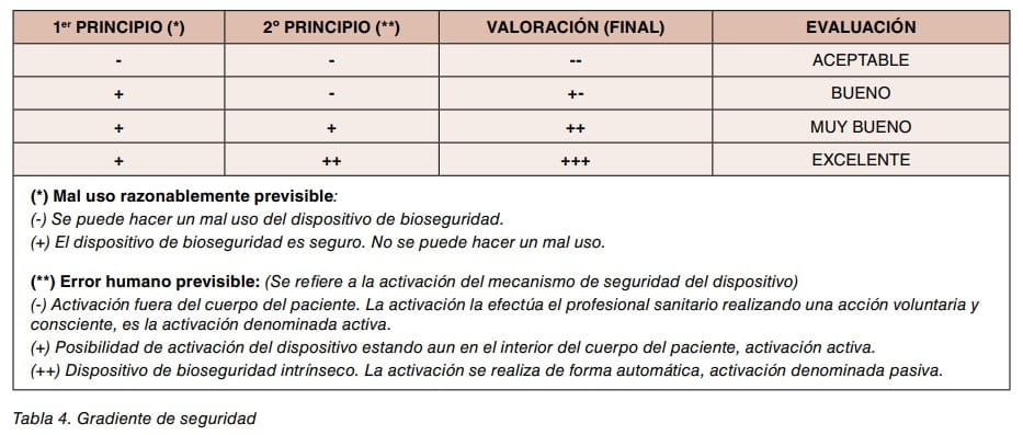 Para aplicar el 2º principio, se asigna el símbolo (-) cuando la activación del dispositivo de bioseguridad depende del acto voluntario del trabajador y únicamente se puede realizar fuera del cuerpo del paciente (activación activa). Se asigna el símbolo (+) cuando la activación del dispositivo se puede iniciar antes de retirar el equipo cortopunzante del cuerpo del paciente (activación activa). Se asigna el doble símbolo (++) cuando el mecanismo de activación es automático, no depende de un acto voluntario (activación pasiva) (tabla 3).