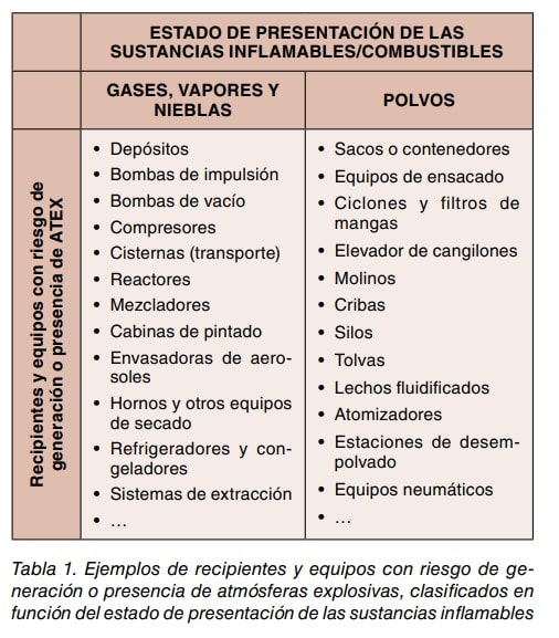 En la tabla 1 se muestra algunos ejemplos de recipientes y equipos con riesgo de ATEX.