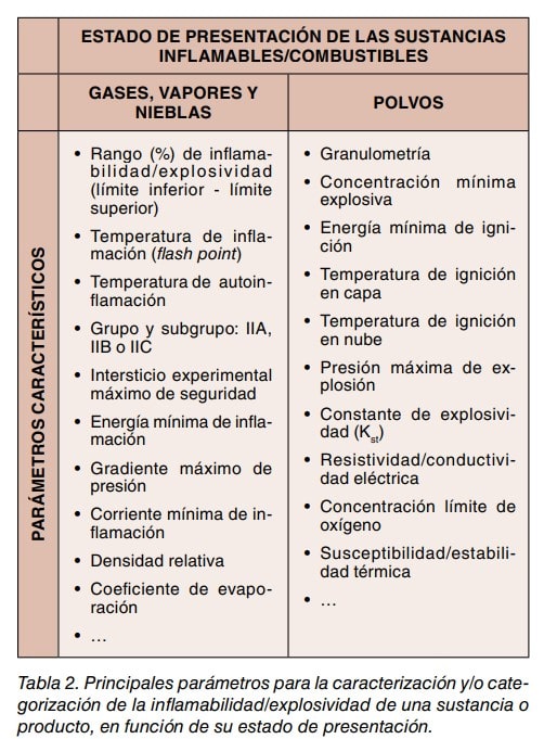 El punto fundamental para determinar la posibilidad de formación de una ATEX es el conocimiento de los parámetros de inflamabilidad y explosividad de las sustancias y productos implicados en las diferentes etapas del proceso productivo (materia prima, productos intermedios, finales, subproductos, etc.). Las características del producto, incluyendo su explosividad, son parámetros fundamentales para el análisis de riesgo. En la tabla 2 se presentan los principales parámetros para la caracterización y/o categorización de la inflamabilidad/explosividad de una sustancia o producto, en función de su estado de presentación: a) gas, vapor o niebla, y b) nube de polvo en aire. Algunos productos de uso cotidiano presentan peculiaridades importantes que deben ser conocidas, como es el caso del azúcar, que presenta en determinadas condiciones una energía de inflamación muy baja. Existen laboratorios de ensayo que están capacitados para determinar estos parámetros según la norma que proceda. A destacar, por su importancia, la interpretación de dichos resultados en las condiciones reales del proceso. Por ejemplo, los límites de explosividad definen el intervalo teórico de explosividad, pero este puede aumentar con la presión y la temperatura. La energía mínima de ignición puede reducirse considerablemente en caso de aumentar los contenidos de oxígeno o trabajar a temperaturas elevadas. La presión y aceleración máximas de explosión aumentan si hay una mayor presión inicial.