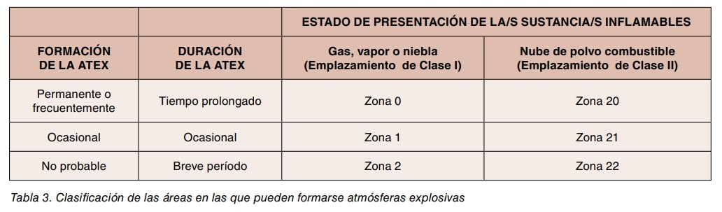 Una vez determinadas las características básicas de inflamabilidad y explosividad de las substancias o productos existentes en cada instalación, se debe analizar la posible formación y duración de la ATEX. La posibilidad de formación de una cantidad peligrosa de ATEX vendrá determinada por la presencia, grado de dispersión y concentración de la sustancia o producto inflamable. Dicho cálculo se basa en analizar la frecuencia y duración con que se produce la mezcla de la sustancia inflamable con el aire. El RD 681/2003 clasifica, siguiendo este criterio, las áreas de riesgo en las que pueden formarse ATEX en zonas. En esta etapa habrá que considerar además de la creación y duración de la ATEX, su probabilidad de formación y la cantidad. Se consideran áreas de riesgo aquéllas en las que puedan formarse ATEX en cantidades tales que resulte necesaria la adopción de precauciones especiales para proteger la seguridad y la salud de los trabajadores afectados. Cabe destacar que, la clasificación en zonas de las áreas en las que pueden formarse ATEX debe tener en cuenta la frecuencia con que se produzcan atmósferas explosivas y su duración, en condiciones normales de explotación. Se entenderá por condiciones normales de explotación la utilización de las instalaciones de acuerdo con sus especificaciones técnicas de funcionamiento. Se establecen tres niveles de probabilidad de formación de ATEX, respectivamente para gases, vapores o nieblas y para polvo combustible: zona 0 o 20 (presente frecuentemente o tiempo prolongado), zona 1 o 21 (formación ocasional) y zona 2 o 22 (formación improbable o sólo un breve período de tiempo). En la tabla 3 se muestra el resumen de esta clasificación, en función del estado de presentación de las sustancias inflamables. Para dicha clasificación se procederá tanto a la identificación y categorización (grado de escape continuo, primario o secundario) de las posibles fuentes de escape como a la determinación del alcance y extensión de las zonas. Un factor determinante en este punto es la disponibilidad y grado de ventilación. En ocasiones, se establece una distinción entre el interior de partes de instalaciones y su entorno.