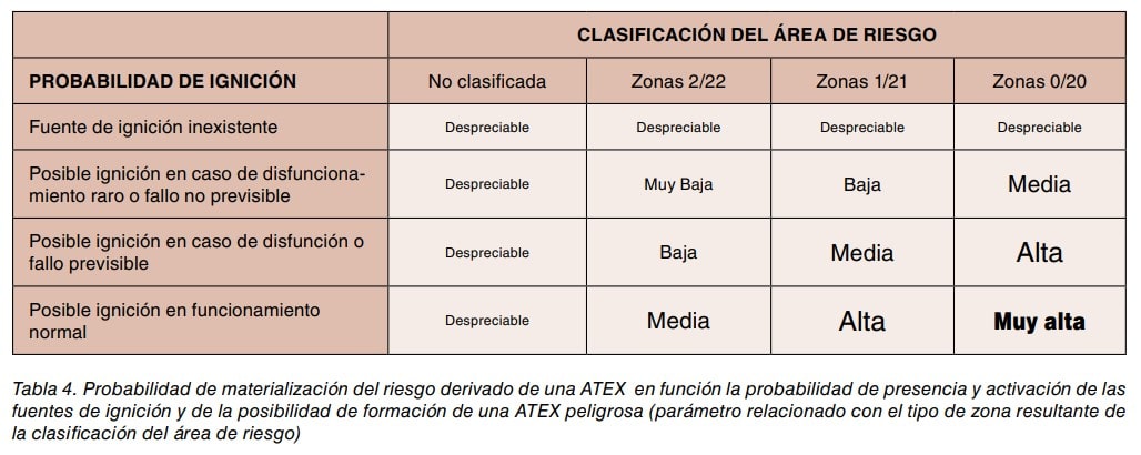 La evaluación de los riesgos permite detectar los puntos críticos de la instalación o unidad y determinar la necesidad de adopción de medidas que eviten o minimicen el riesgo de explosión. Una vez conocidos los parámetros anteriormente expuestos se debe proceder a la estimación del riesgo, entendiendo como tal la determinación de la probabilidad de materialización del riesgo derivado de una ATEX. Para ello se propone, en la tabla 4, la matriz que combina la probabilidad de formación y duración de la ATEX (parámetro estimado a partir de la clasificación del área de riesgo en zonas) y la probabilidad de presencia y activación de la/s fuente/s de ignición. Así, la materialización del riesgo presenta cinco niveles de probabilidad (muy baja, baja, media, alta y muy alta).