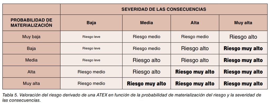 Una vez estimado el riesgo específico derivado de la ATEX y habiendo analizado sus posibles consecuencias (estimación real de los efectos), se realiza la valoración del riesgo de explosión con el fin de determinar si se requiere reducir el riesgo o si se ha alcanzado la seguridad. Para la valoración final del riesgo de explosión se presenta, en la tabla 5, la matriz resultante del producto de la probabilidad de materialización del riesgo por la severidad de las consecuencias. La prioridad de intervención vendrá determinada en función del resultado de esta matriz, que presenta cuatro niveles de riesgo, cuyo significado se presenta a continuación.