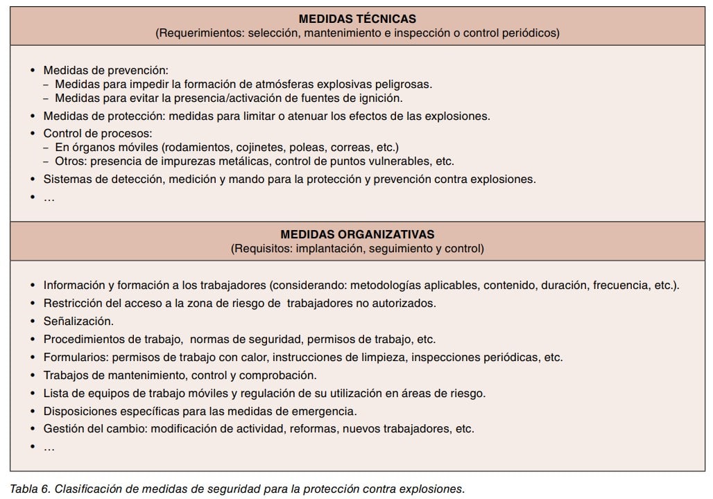 Si del resultado de la valoración se desprende que es necesario disminuir el riesgo, entonces se deben seleccionar y aplicar o adoptar las medidas de seguridad apropiadas, tanto para reducir la probabilidad de materialización del riesgo (evitar la formación e ignición de ATEX peligrosas) como para mitigar o atenuar los efectos perjudiciales de una explosión de forma que se garantice la salud y seguridad de los trabajadores. En la tabla 6 se presentan, de forma esquemática, algunas medidas de seguridad para la protección contra explosiones. Estas medidas engloban tanto medidas técnicas como medidas organizativas. Estas medidas se combinarán o completarán, cuando sea necesario, con medidas contra la propagación de las explosiones. Se revisarán periódicamente y, en cualquier caso, siempre que se produzcan cambios significativos.