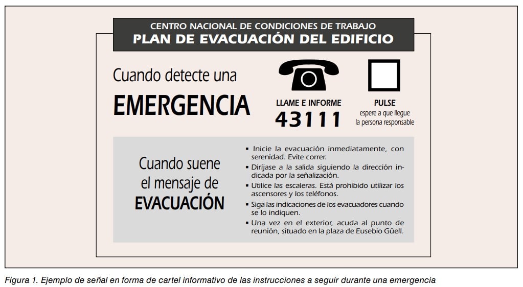 Una forma de facilitar información sobre las instrucciones a seguir ante una emergencia por parte de los ocupantes de un centro, es por medio de carteles explicativos en forma de panel, dirigidos sobre todo al personal ajeno a la empresa que puedan encontrarse en el edificio (ya sea visitas, clientes o público en lugares de pública concurrencia). En este tipo de señales en forma de cartel se facilitará una información sencilla, breve y clara sobre qué hacer en caso de una emergencia por parte de estas personas. Un ejemplo podría ser el que se muestra en la figura 1.