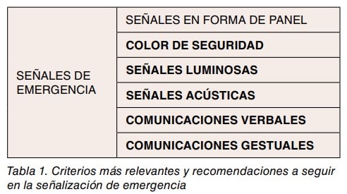En la tabla 1 se describen algunos de los criterios más relevantes y recomendaciones a seguir en la señalización de emergencia para los diferentes tipos de señales de emergencia: