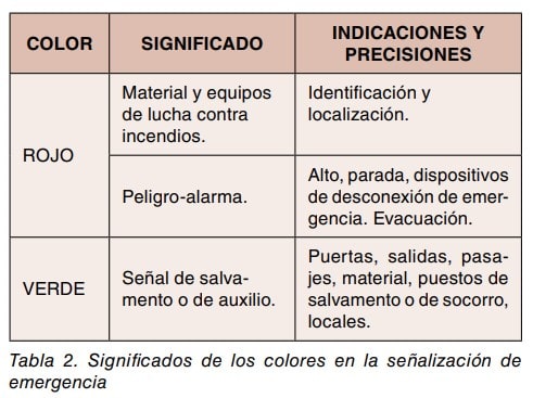 Los colores de seguridad podrán formar parte de una señalización de seguridad o constituirla por sí mismos. El color de seguridad es aquel color al que se atribuye una significación determinada en relación con la seguridad y salud en el trabajo. En el caso concreto de la señalización de emergencia se trata de los colores rojo y verde con siguientes significados que se indican en la tabla 2.
