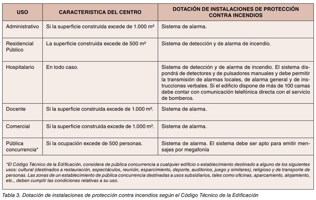 En determinados centros incluidos dentro del ámbito de aplicación del Código Técnico de la Edificación, en función de su uso y de su superficie construida ,deberá disponer obligatoriamente de un sistema de alarma, tal y como se muestra en la tabla 3.