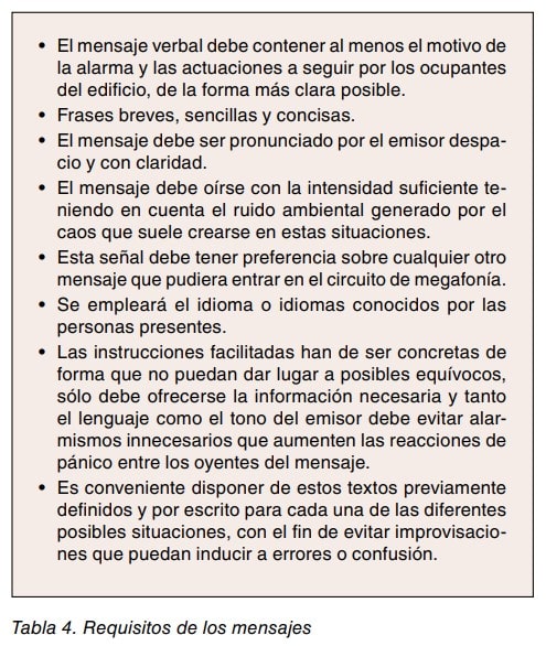 En cualquier caso, debe garantizarse su funcionamiento incluso en las situaciones en las que se produzca un corte del suministro eléctrico y los mensajes deberán ser perfectamente audibles para todas las personas presentes a las que vaya dirigido el mensaje. Para ello, el mensaje cumplirá con los requisitos que se indican en la tabla 4.