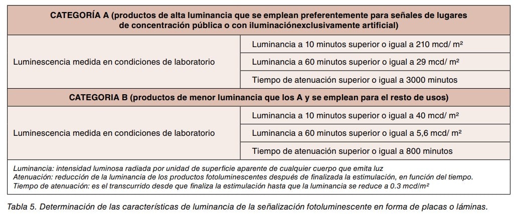 En el caso de señales en forma de panel fotoluminescentes según el Código Técnico de la Edificación su mantenimiento se realizará conforme a lo establecido en la norma UNE 23035-3:2003. En esta norma UNE se indica que además del control anual establecido en la misma norma, cada cinco años debe llevarse a cabo una medición. Cuando el resultado obtenido es igual o inferior al 80% de los mínimos obligatorios marcados en la norma UNE 23035-4 y que se muestran en la tabla 5 (medidos según la norma UNE 23035-2), se debe proceder a la sustitución de la señal o subsanación de la deficiencia. La acumulación de polvo, erosión ambiental por humedad o viento, así como la limpieza periódica de este tipo de señales o de los balizamientos fotoluminescentes que pueden existir en un centro de trabajo para indicar los caminos de evacuación, va disminuyendo la luminescencia inicial del producto y por tanto mermando la eficacia de la señalización, de ahí la importancia de llevar a cabo la inspección y control correspondiente en estos productos fotoluminescentes.