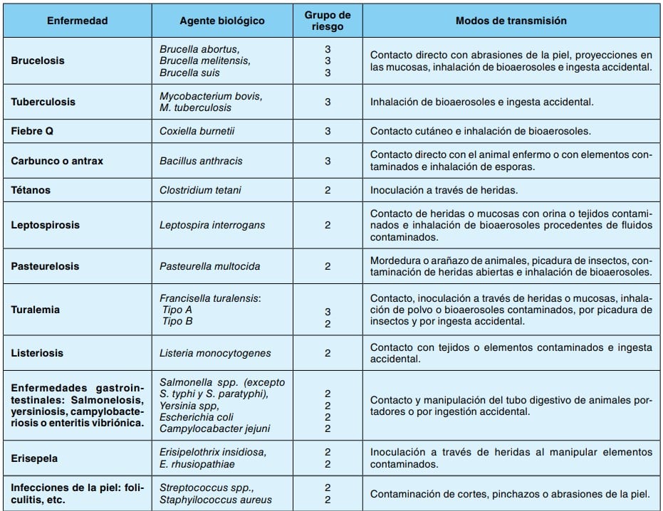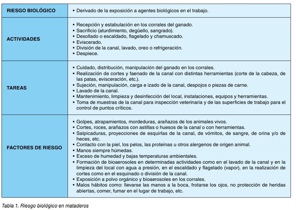Teniendo en cuenta las actividades descritas el riesgo biológico para los trabajadores deriva principalmente del contacto con los animales, sus productos y sus desechos potencialmente contaminados con microorganismos patógenos o alteradores. Las principales vías de exposición y de entrada en el organismo de los agentes patógenos son el contacto con la piel y las mucosas, la penetración a través de heridas, mordeduras, arañazos, pinchazos o cortes con materiales cortopunzantes (cuchillos, huesos astillados, etc.), la ingestión como consecuencia de malos hábitos higiénicos y la inhalación de bioaerosoles.