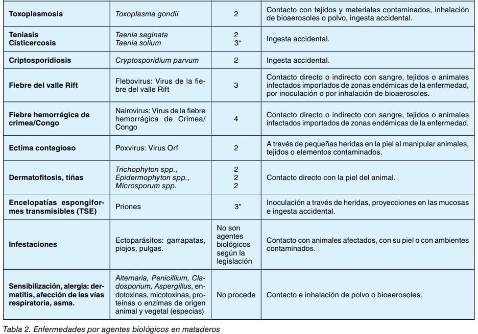 Los principales daños para los trabajadores de la industria cárnica derivados de la exposición a agentes biológicos son las dermatitis de contacto irritativas y alérgicas, asma y enfermedades infecciosas o parasitarias conocidas como zoonosis (ver tabla 2).