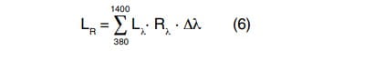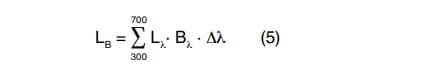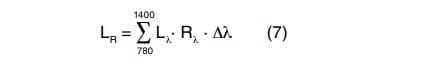 La ponderación consiste en multiplicar la irradiancia espectral de la fuente E l (o irradiancia en cada longitud de onda) por cada uno de los factores de corrección (“pesos”) adjudicados en la curva S(l) y por la distancia entre una longitud de onda y la siguiente (Δl). A continuación habrá que sumar todas las contribuciones parciales para obtener la irradiancia total ponderada de la fuente (Eeff). Matemáticamente: