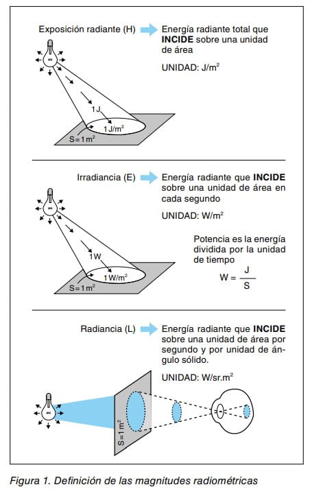 La exposición laboral se expresa en alguna de las siguientes magnitudes: Irradiancia E, Radiancia L o Exposición radiante H. Para más información ver la figura 1.