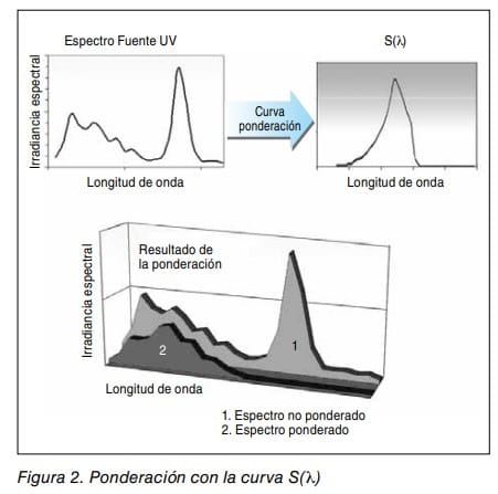 De esta forma se han obtenido las curvas de ponderación biológica, llamadas también curvas de ponderación espectral o de efectividad espectral, que se utilizan para corregir los valores de la exposición en cada región del espectro óptico. En el anexo I apartado C del Real Decreto se describen tres curvas o funciones de ponderación diferentes: