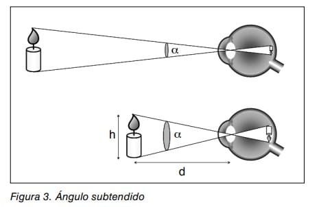 El ángulo subtendido (a) se define como el tamaño aparente de un objeto, en este caso una fuente de radiación, medido en la posición de los ojos. Se calcula dividiendo la altura real del objeto (h) por la distancia al punto de medida (d). Es parámetro muy importante porque determina la cantidad de radiación que penetra a través de la pupila y alcanza la retina.