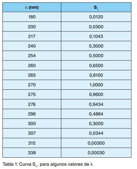- S(l) o efectividad espectral para el UV (180 400 nm). Ver tabla 1.