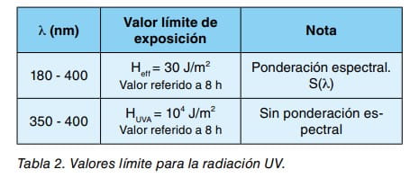 Los riesgos para la piel y los ojos, asociados a la exposición a radiación ultravioleta son: fotoqueratitis, fotoconjuntivitis, cataratas, eritema, elastosis y cáncer de piel. Para proteger a los trabajadores de estos efectos, se establecen dos valores límite de exposición de la Tabla 2.