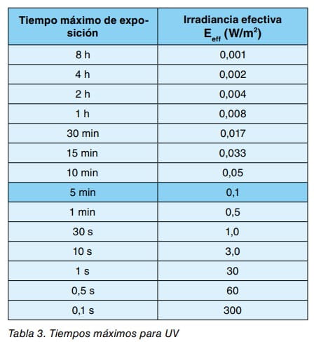 En el caso de querer calcular el tiempo de exposición máximo permitido, basta con dividir el valor límite por la irradiancia medida o calculada de la fuente.