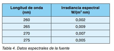 Determinar la exposición laboral debida a una lámpara germicida de radiación ultravioleta. Se ha medido la irradiancia espectral en la posición del trabajador (a 1,5 m de la fuente) con un espectrorradiómetro que no incluye ponderación espectral, obteniéndose los siguientes resultados de la Tabla 4.