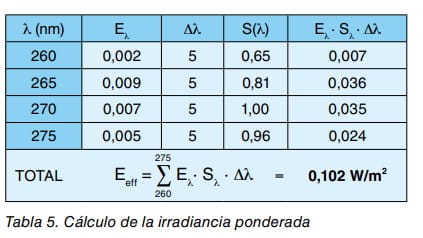 La exposición radiante efectiva se calcula a partir de la irradiancia efectiva (Eeff), utilizando la expresión (1).